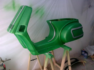 Otra vista desde la parte de atrás, donde se aprecia la vista que tendrá quien conduzca la moto, en este caso, yo.El guardabarros se suma a la fiesta, en algunos puntos, las lineas no están muy bien definidas y se observa que la pintura ha calado hacia la parte verde, de todas maneras sólamente hay que retocar en algunos sitios.